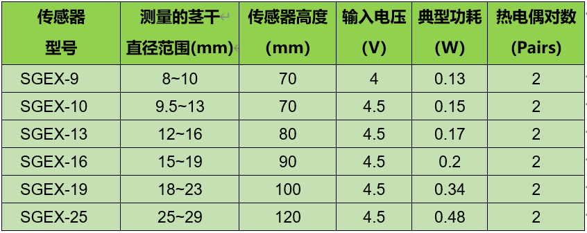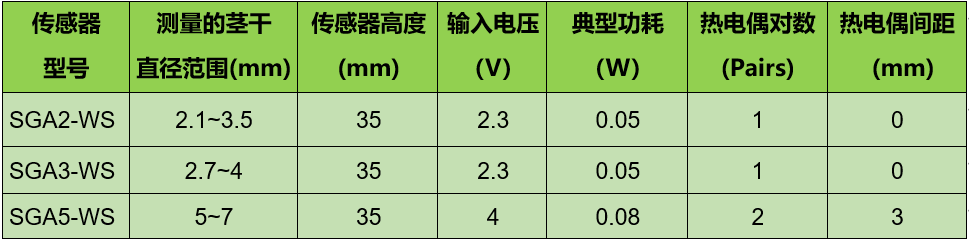 可測量8~29mm直徑的莖干,適用于葡萄、獼猴桃等藤本植物,其莖干的特點是多結(jié)節(jié),且相鄰兩個結(jié)節(jié)間距很短。測量時,傳感器可以纏繞在植物莖干上。該傳感器很薄,柔韌性強,用透氣性較好的彈力尼龍纖維做阻熱材料,其較短的豎向長度非常便于安裝,而且更易貼合具有不規(guī)則生理彎曲的莖干。型號如下: